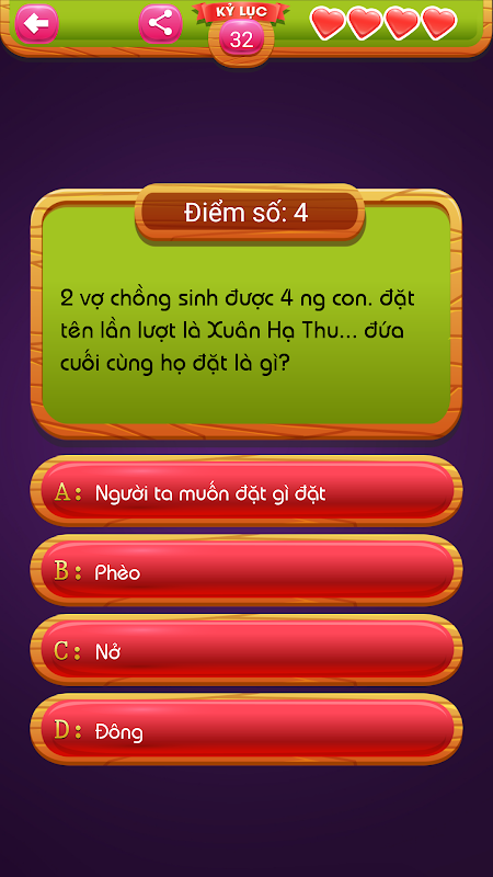 Trò chơi bao gồm các câu hỏi mẹo, câu hỏi troll, hại não được biên tập viên tuyển chọn kĩ lưỡng, không trùng lắp. Các câu hỏi dễ mà khó, khó mà dễ sẽ đem lại cho bạn những trận cười sảng khoái, hả hê sau giờ học tập, làm việc căng thẳng.