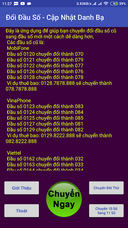 Ứng dụng giúp cho việc chuyển đổi đầu số cũ 11 số trong danh bạ của bạn theo đầu số mới 10 số của các nhà mạng một cách dễ dàng hơn bao giờ hết. Thay vì phải mở từng địa chỉ liên hệ để thay đổi đầu số rất mất thời gian và rất dễ sai xót thì giờ đã có Đổi Đầu Số - Cập Nhật Danh Bạ bạn chỉ cần nhất nút bắt đầu và đợi vài giây là danh bạ của bạn đã được cập nhật một cách chính xác theo từng số và theo đúng đầu số mới mà bạn không cần phải làm gì thêm nữa. Ngoài ra ứng dụng không yêu cầu quyền truy cập internet nên bạn hoàn toàn có thể yêu tâm về việc thu thập dữ liệu danh bạ của người dùng. Vì đây là một ứng dụng đầu tay nên không thể tránh được những sai xót và lỗi nên mong các bạn góp ý nhiều hơn. Xin trân trọng cảm ơn bạn đã lựa chọn Đổi Đầu Số - Cập Nhật Danh Bạ của Trần Đức Luân.