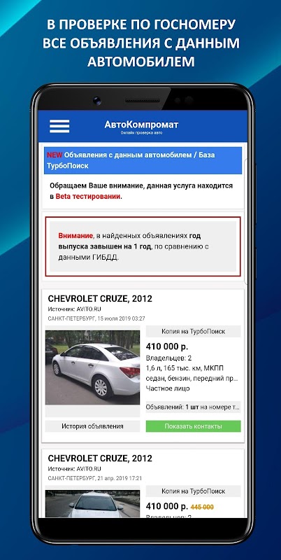 Install the AutoKompromat application and you will be able to thoroughly check, by VIN or State number, cars registered in Russia, quickly and conveniently in one click!