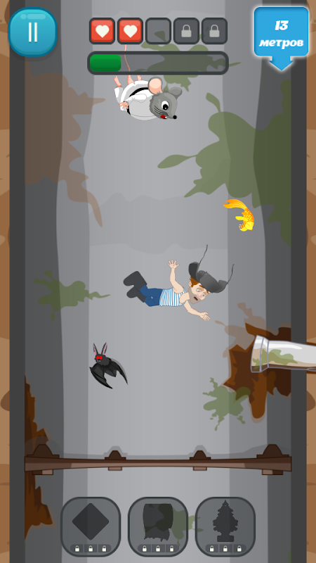 Кузьмичу нужно освоить гравитацию в небе, космосе и канализации. Тебя ждет атмосферный хаос: облако, космос, канализация. Там летают: коровы, гуси, метеориты, телевизор и даже пришельцы. Водка роскошь здесь, поэтому будь начеку не пропускай спирт, только он спасет от падения.