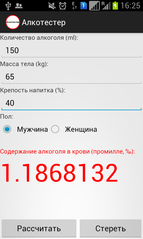 Алкотестер поможет Вам определить, какое приблизительное количество алкоголя содержится в Вашей крови после употребления спиртных напитков. Скачайте калькулятор алкоголя в крови. Заполните поля в приложении и нажмите кнопку "Рассчитать"!