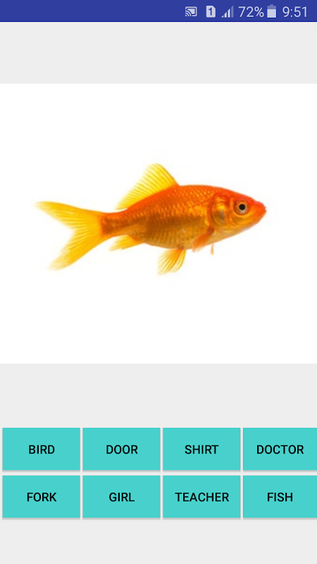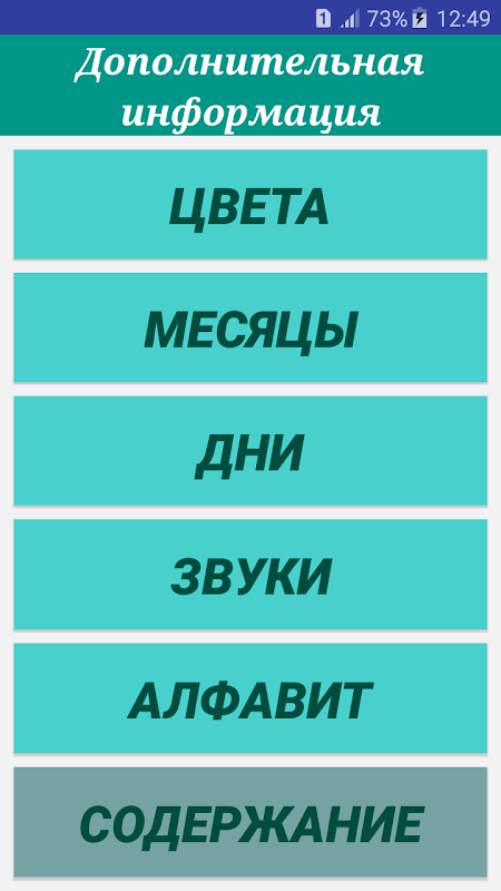 В 25 уроках есть кнопка "Проверить знания", перейдя по которой вы увидите другой экран, на котором в случайном порядке показываются картинки или слова, а пользователь должен нажать кпонку, соответствующую правильному ответу. Если отгадано правильно, то появляется следующая картинка, если неправильно – то появляется всплывающее сообщение «Неправильно».