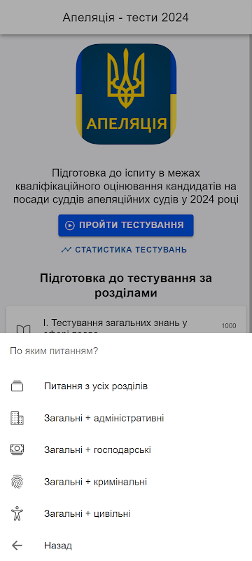The mobile application "Appeal - testing" was developed to enable quick and convenient preparation of interested persons for the competition for the position of appellate court judge in 2024 (qualification assessment of candidates for the position of appellate court judge)