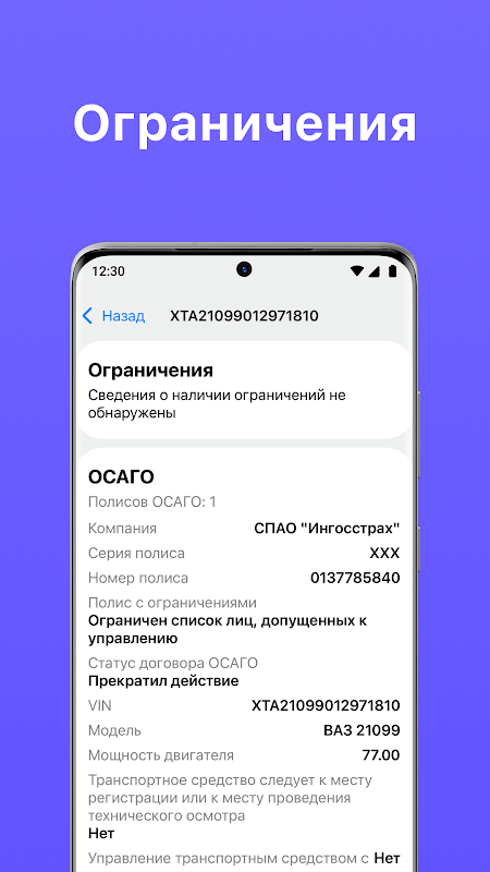 Get official information from different sources in one place: traffic police database, Federal Notary Chamber, EAISTO, FTS, RSA.