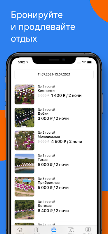 Vacation begins not with arriving at the base, but with booking a room or a place of rest. You can choose the appropriate option directly in the application. There is a description of each zone and all types of rooms and houses that can be booked, including their equipment and services included in the price. Checkout is also carried out in the application.