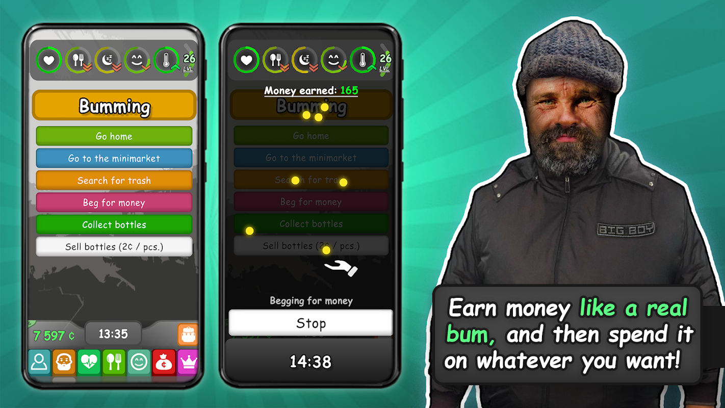 This is not a simulator of turning from a homeless person to a millionaire in one day - things are much more complicated here, come and check it out for yourself! Try to survive on hardcore, although few people manage to do so.