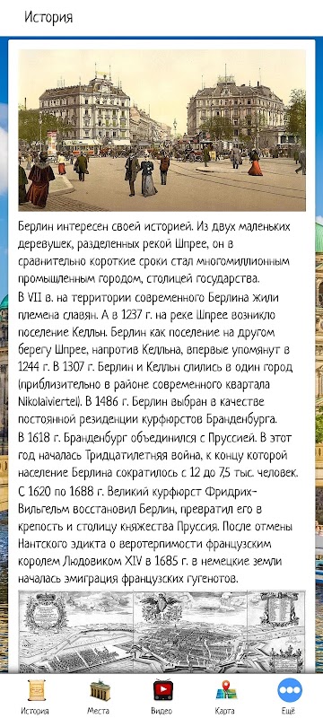 In the application, you can make an initial acquaintance with the city of Berlin, choose a place for a trip by looking at the sights and video reviews. Also in the application there is information about tour agencies, travel agencies and hotels offering their services in the selected city.
