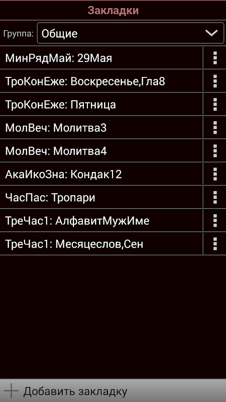 The application allows you to view the texts of various books in the Church Slavonic language. Books are downloaded from a remote server and stored on the device's SD card for later offline reading.