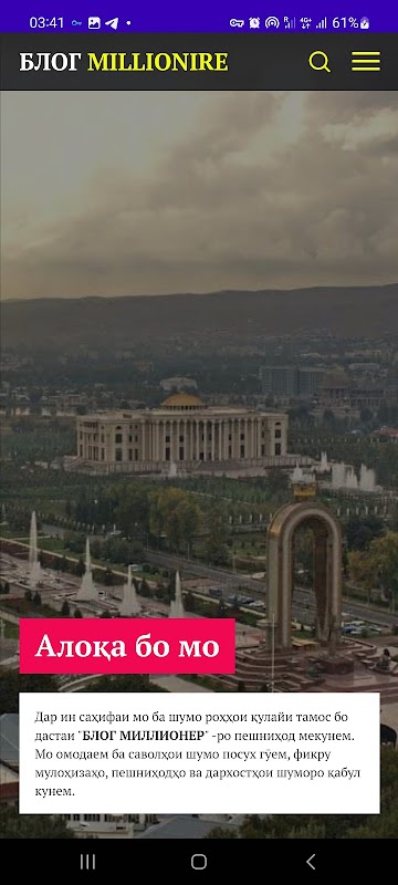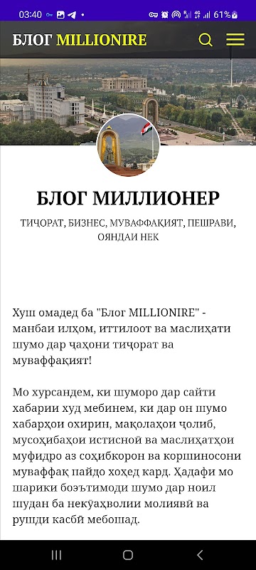 Барномаи Блог MILLIONAIRE барномаи мобилии машҳур аст, ки хабарҳои муосир, мақолаҳои муфид ва мундариҷаи илҳомбахшро дар бораи тиҷорат ва муваффақият пешниҳод мекунад. Акнун шумо имкон доред, ки ба маълумоти навтарин ва мундариҷаи ҷолиб бевосита дар дастгоҳи мобилии худ дастрасӣ пайдо кунед.