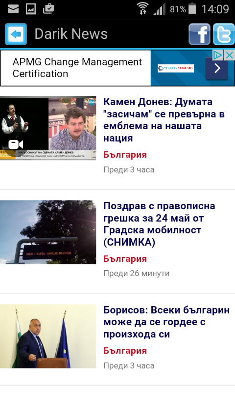 Чрез него можете да видите медународни новини, спортни новини, прогноза за времето. Споделете ги във Facebook или Twitter