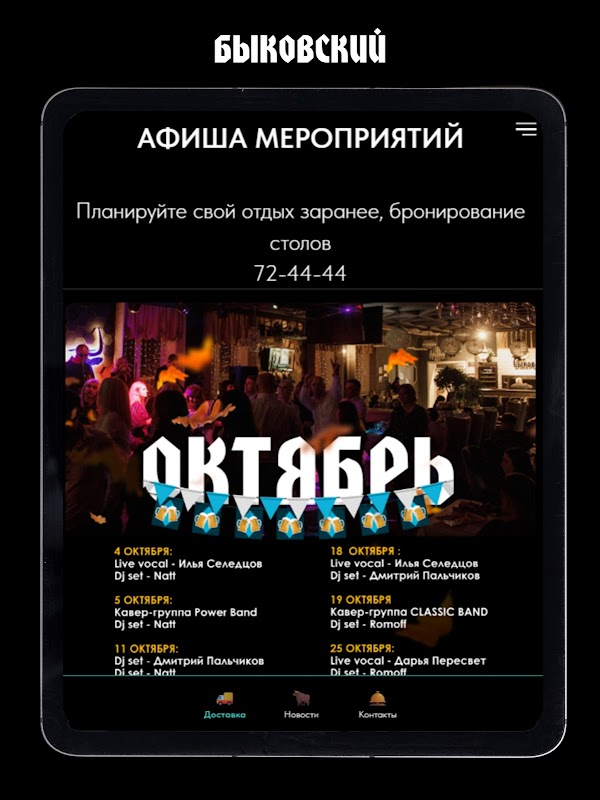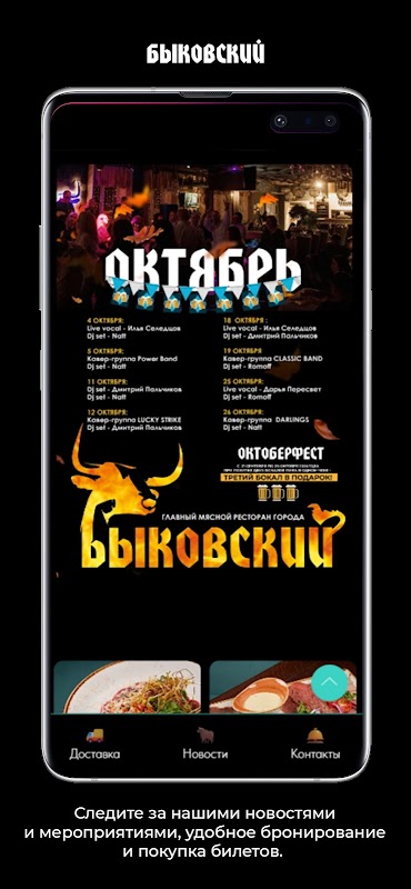 Restaurant Bykovsky Bryansk - a legendary meat restaurant! Where everyone will find something interesting for themselves! Cozy interior, original cuisine and bar, as well as an exciting entertainment program! In the application you will find regularly updated profitable promotions, convenient and fast delivery of your favorite dishes, booking tables in two clicks and all the latest news from Bykovsky’s life.
