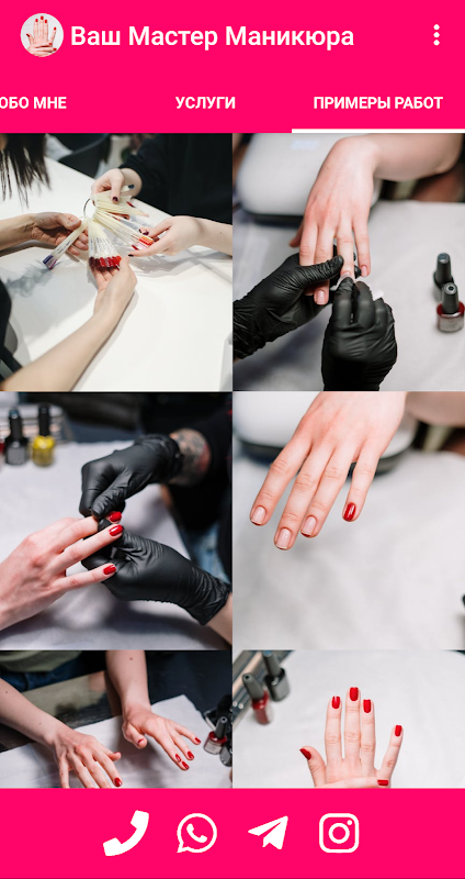 Это приложение демонстрирует, какой функционал можно разработать для мастера маникюра при помощи сервиса по созданию приложение GiveMeApp. Хотите такое же приложение? Заходите в сервис GiveMeApp и создайте свое приложение с помощью удобного конструтора бесплатно!