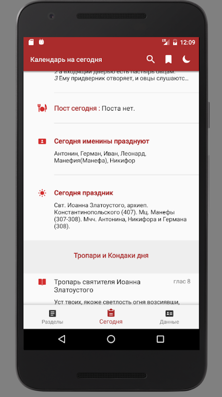 This application contains texts in civil script and in Church Slavonic language without abbreviations and marks (all the nuances depending on the calendar change automatically).