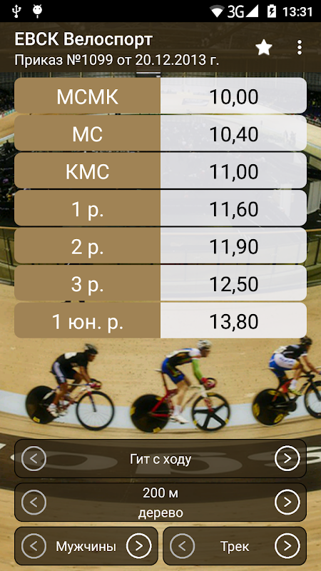 Если вы хотите знать с каким временем вам нужно ехать на велосипеде, чтобы получить спортивный разряд или спортивное звание эта программа будет вам весьма кстати.