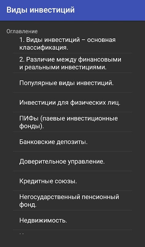 Приложение рассказывает о инвестициях. Подробно рассказано о каждом виде: недвижимость, паевые фонды, депозиты, бизнес и многие другие.