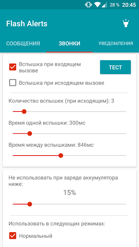 + Настройка выключения вспышки при определенном заряде батареи, а так же при определенном режиме звука (бесшумный, вибрация, нормальный)