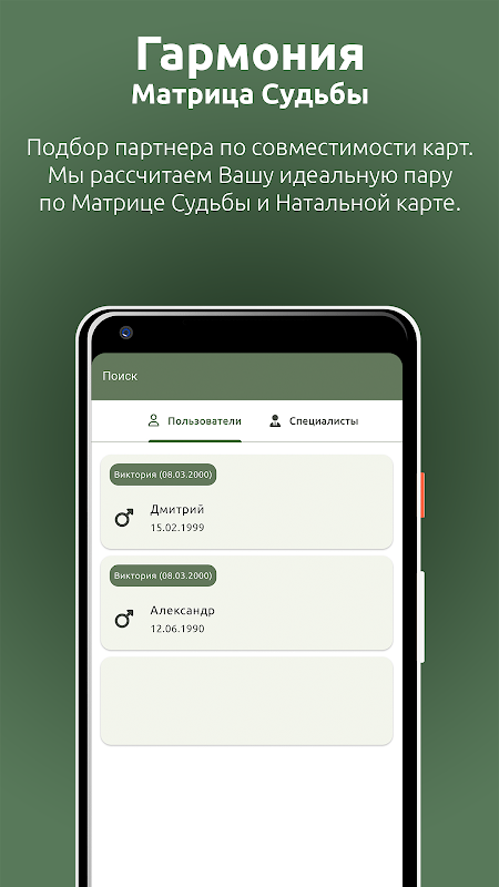 Our app uses your date of birth to calculate your Destiny Matrix, Natal Chart, and Pythagorean Square. No more lengthy questionnaires—just the precise science of your energy and compatibility.