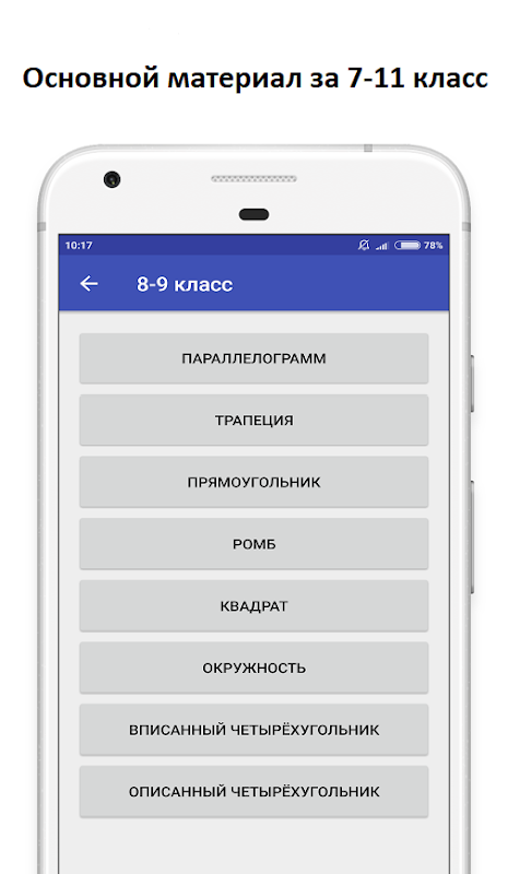 This application contains the basic terms and for formula 7, 8, 9, 10, and 11 classes. With this application, you can improve your knowledge of geometry or repeat already completed topics. The materials presented in this application are often found as ordinary school examinations, and the OGE and the exam.