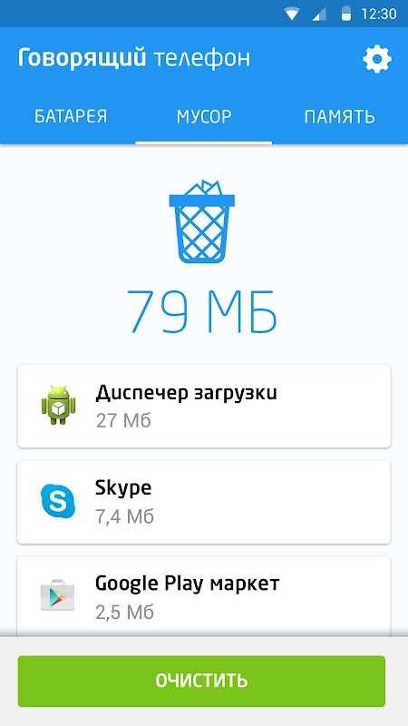 Приложение озвучивает состояние батареи, а так же вид подключения USB или AC, говорит время, сообщает о пропущенных звонках и непрочитанных сообщениях.
