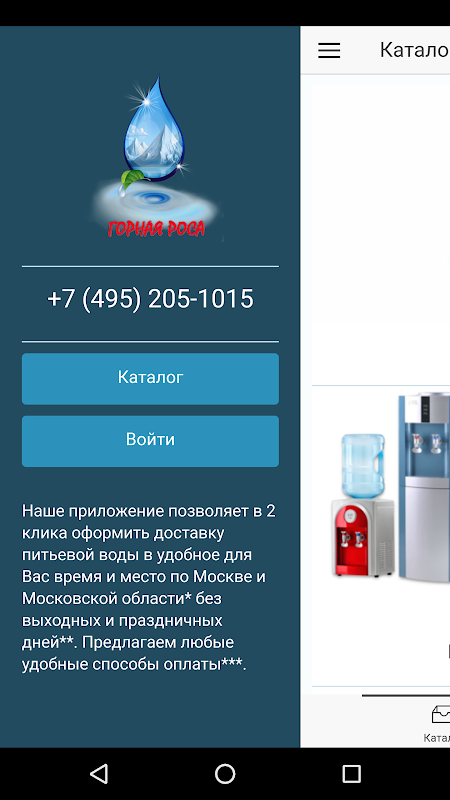 Our application allows in 2 clicks to arrange delivery of drinking water at a convenient time for you and place in Moscow and the Moscow region * without days off and holidays **. We offer any convenient payment methods ***.