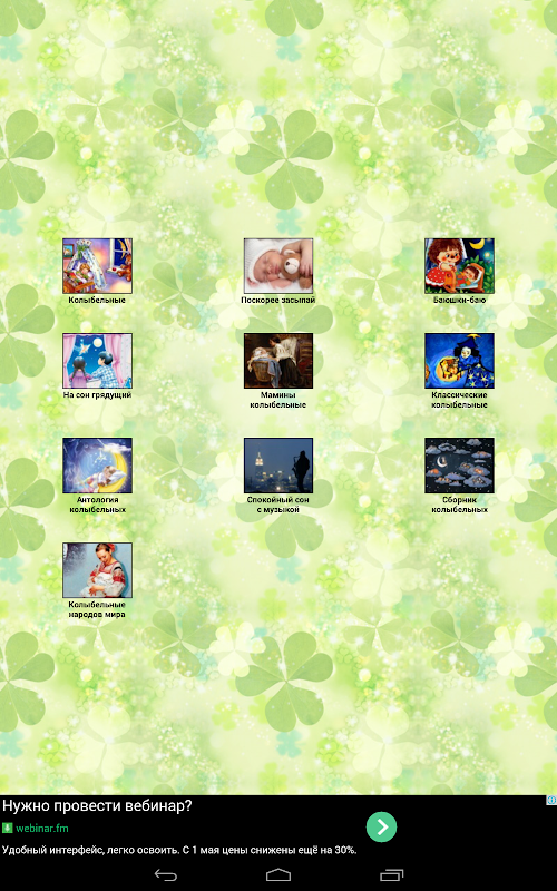 Это приложение - сборник детских колыбельных песен для Вашего малыша. Сборник включает в себя 10 разделов со старыми, добрыми колыбельными русских и зарубежных авторов. Музыка для колыбельных написана выдающимися музыкантами нашего и прошлого века, такими как Чайковский, Моцарт, Бетховен.