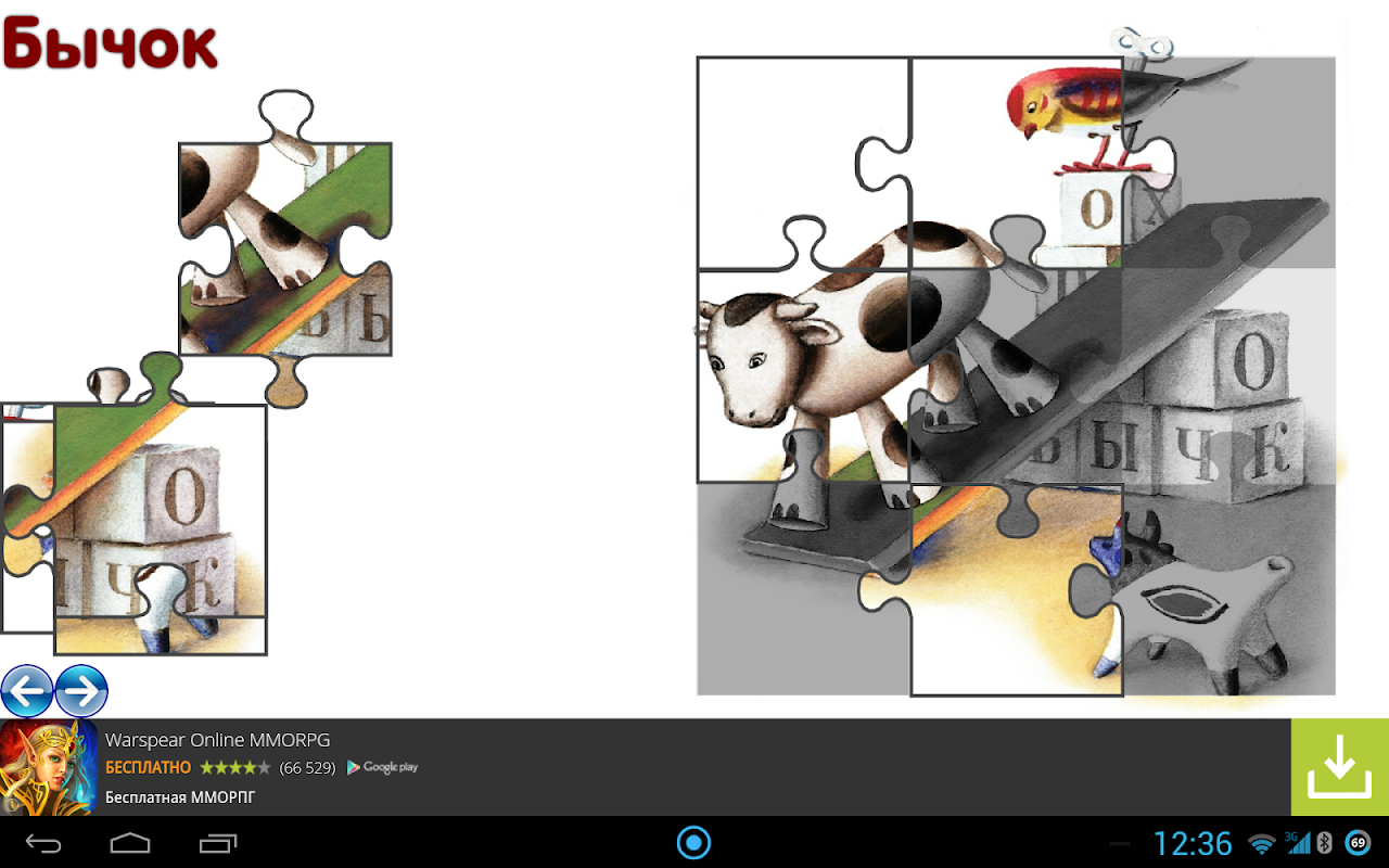 Три вида игр: пазлы, найти парные рисунки и стереть фигуру пальчиком.