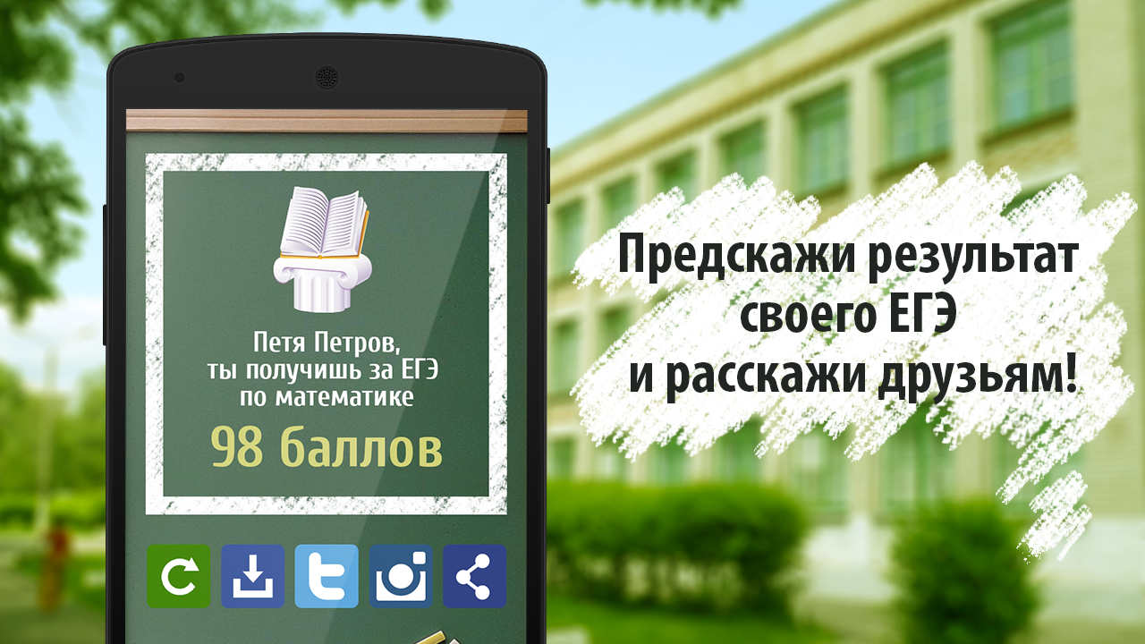 ЕГЭ экзамен 2015: Прогноз предлагает узнать результаты тестов по предметам на выпускном экзамене! Сдаешь русский язык, литературу, математику? Узнай как подготовила тебя школа к ЕГЭ! Выбери предмет из расписания, запусти Прогноз! Если не доволен результатом, измени уровень подготовки и напиши тесты как босс! Если результат прогноза хороший, покажи друзьям и продолжай готовиться, чтобы сдать ЕГЭ на отлично! Сравни результаты экзаменов с прогнозом после теста и поделись ими с учителями на выпускном!