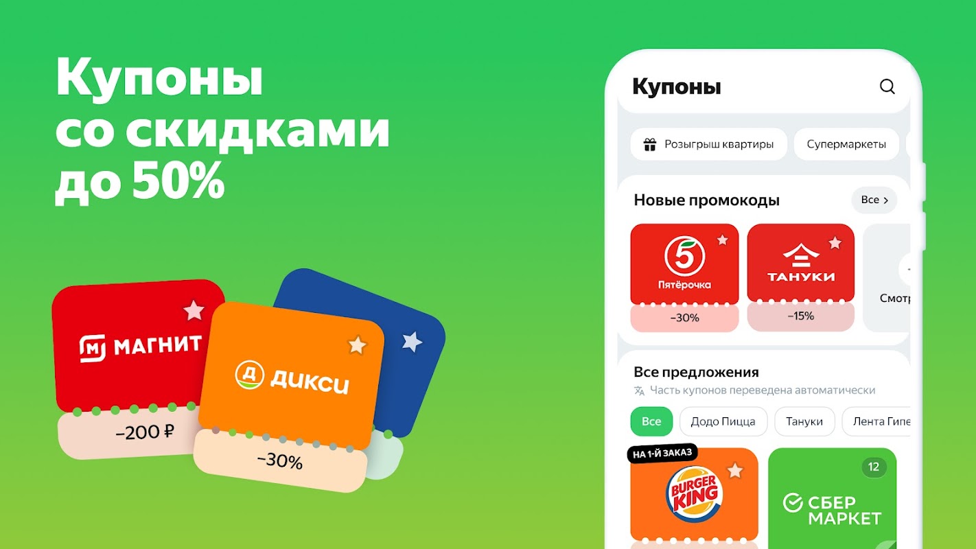 We've collected discounts from thousands of stores: from local shops to national chains. Among them are Lenta, Dixie, Perekrestok, Metro, Bristol, Spar, Fix Price, Krasnoe & Beloe, O'Key, Azbuka Vkusa—and that's not even a list of the supermarkets available!
