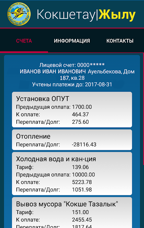 Программа позволяет узнать состояние счетов за коммунальные услуги ГКП на ПХВ "Кокшетау Жылу".