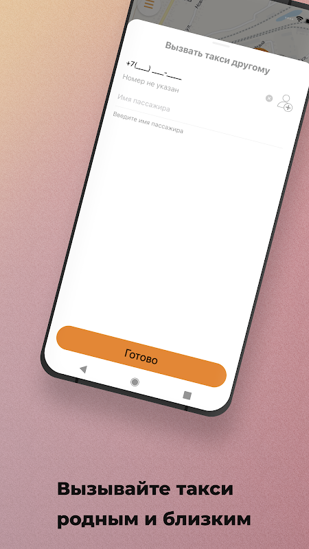Use the option “Call a taxi for someone else” in the “Wishes” section and indicate his phone number. When the taxi arrives, an SMS will be sent to the specified number, and you will receive a message in the application.