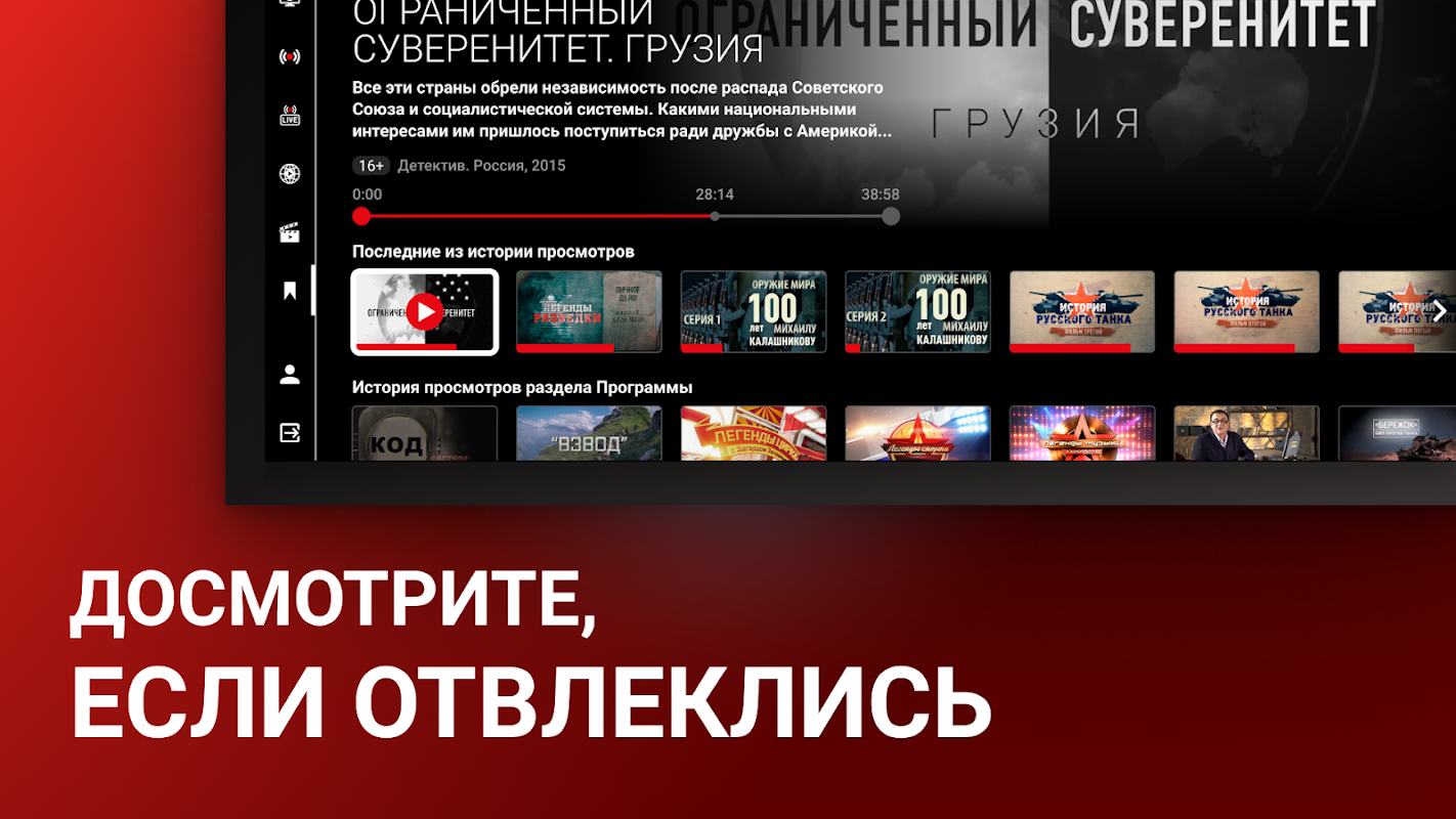 В обновленном приложении теперь удобный поиск по программам, трансляциям и фильмам на любую тему. А кроме того, теперь приложение запоминает место, до которого вы досмотрели. Поставьте на паузу любое видео и в верхней части экрана рекомендательная система посоветует вам интересную подборку по выбранной теме.
