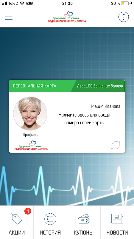 Protect your health is very important for every human being. Pharmacy and Medical Center "Healthy Family" is a multi-partner medical institution, where you can get a full range of services from the purchase of medicines, diagnostics to rehabilitation. We care about the comfort of each patient. With the application you will be able to see special offers from pharmacy and medical center. The app replaces your plastic discount card. Now if you forget it at home, or do not want her to carry - you can simply submit an application at the box office (show the barcode administrator or pharmacist).