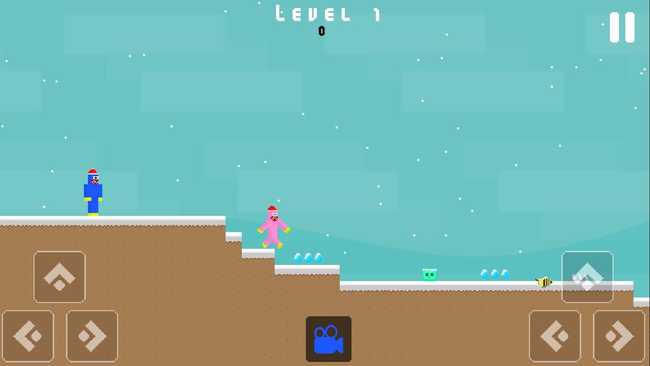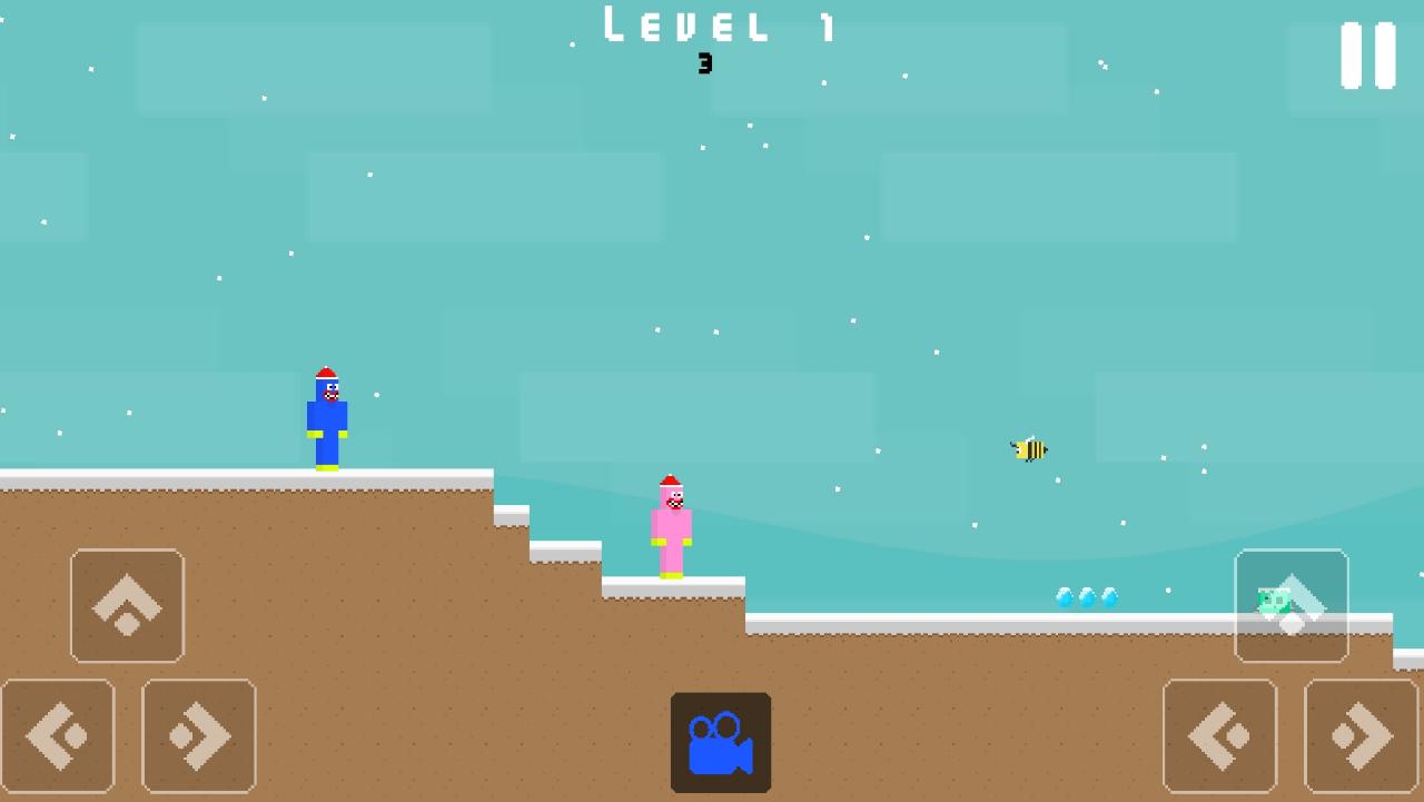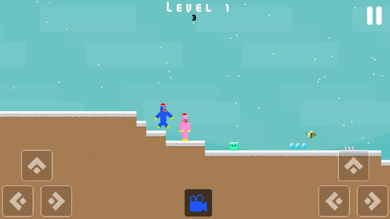You must help them survive in the jungle and get home. Huggy and Kissiy miss their home so much and there are many dangers on the way to go home. It's snowing and it's getting cold. They need to watch out for the enemies in the snowy forest. You have to watch out for the bees and slime or you may die. Complete 10 different maps and reach home.
