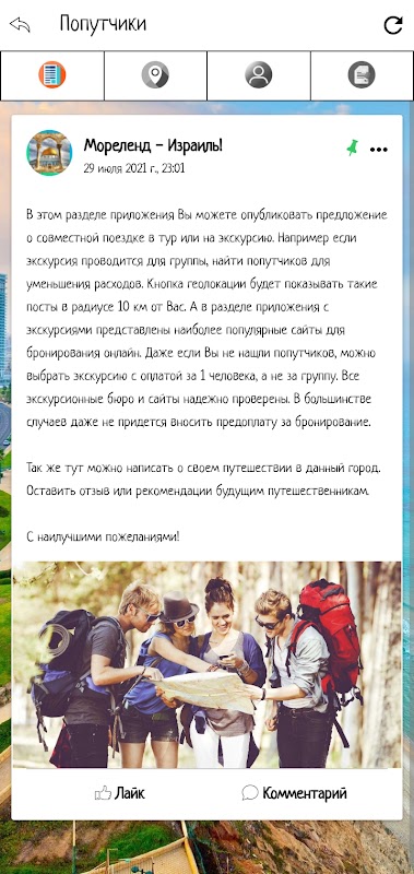 There are times when you are traveling alone or in a couple, and you want to go on an interesting excursion, but it is expensive, as the guide charges a group fee. In this application, you can find fellow travelers for joint excursions, and reduce the cost of the tour. In the "Fellow travelers" section of the application, publish your post and it will be visible to other users of the application within a radius of 10 kilometers. And when you click on the "geolocation" icon, you yourself can see other such offers within a radius of 10 kilometers from you! Additionally, in the application, you can make an initial acquaintance with the cities of Israel, choose a place to travel by looking at the sights and video reviews. The application also contains information about tour agencies, travel agencies and hotels offering their services in the selected city.