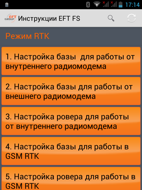 Application instructions for EFT Field Survey Program will become better acquainted with the program. It includes all the necessary instructions on how to set up and work with the program and EFT equipment. For convenience, all the instructions are divided into sections, and in the case of updating any instructions or the emergence of new, the program will make their own updates if an Internet connection. For a better perception of information text instructions can zoom in and out using the keys in the lower right corner of the screen or swiping with two fingers.