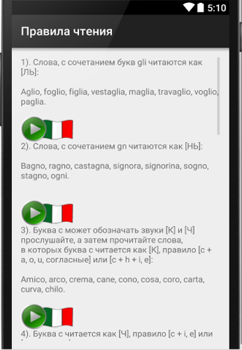 Приложение поможет Вам научиться говорить по-итальянски, ознакомиться с произношением и грамматикой этого языка. Интерактивные упражнения помогут выучить итальянский лучше любого учебника.