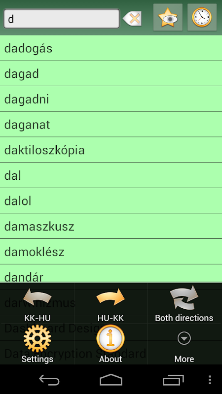 This is Kazakh Hungarian Dictionary - Kazah-Magyar és Magyar-Kazah Szótár Венгерско-Казахский и Казахско-Венгерский Словарь). The Application is OFFLINE and does not need the internet connection.