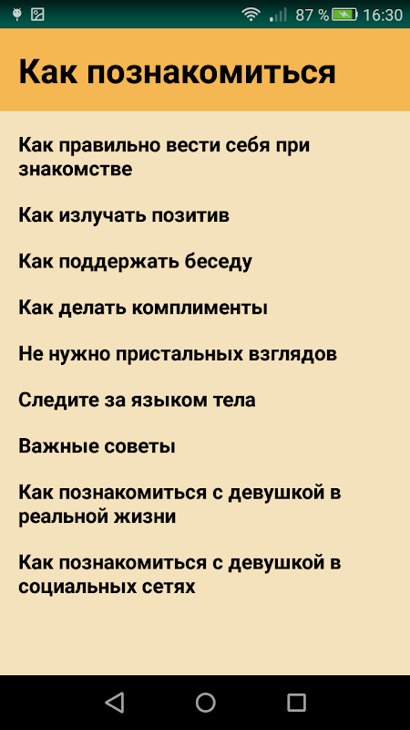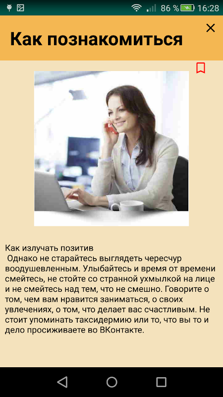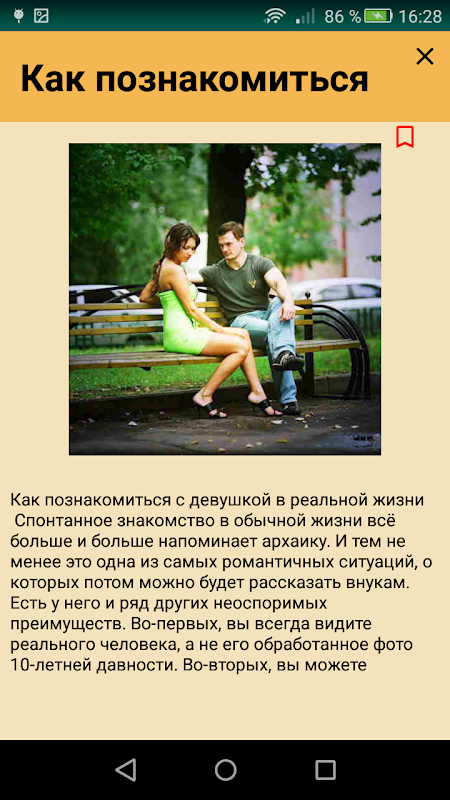 Каждый знает, как важно произвести первое впечатление. Если вы хотите завести новых друзей, но при этом не хотите показаться «чудаком», вам необходимо научиться проявлять интерес к людям, не выражая при этом чрезмерного желания или даже отчаяния познакомиться. Если вы хотите научиться заводить знакомства и не выглядеть странным, необходимо поработать над собой. Вот к примеру перед вами стоит человек, с которым вам по тем или иным причинам нужно построить диалог. Что чаще всего нас останавливает? Боязнь выглядеть нелепо, сказать что-то глупое и неуместное, одним словом — неуверенность в себе.Такая ситуация касается не только романтических отношений, но и деловых вопросов. Представьте ситуацию, в которой вы находитесь на важном мероприятии и где, как ни здесь, вам нужно завести полезные знакомства. Другой, хорошо знакомый многим случай, когда среди случайных прохожих из толпы ваш взгляд выловил того самого человека. Вы стоите в оцепенении и не можете сделать даже небольшой шаг на встречу. Ваша неуверенность лишает вас потенциальных шансов на успех. В нашем приложении мы собрали самые эффективные советы и практики которые помогут вам познакомится с кем угодно. Приложение содержит разделы: