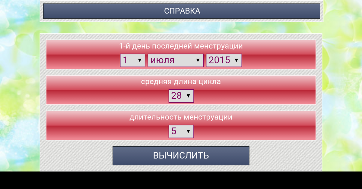 Узнайте ваши дни овуляции, менструации, благоприятные для зачатия дни и безопасные дни для занятия сексом. Женский календарь зачатия и овуляции простое в использовании приложение, служит для расчета менструального цикла и наиболее подходящего периода зачатия ребенка. Укажите дату последней менструации и ее продолжительность и общую длительность цикла. В календаре овуляции будут отмечены фертильные дни, в них вероятность зачатия достаточно высока, а также дни овуляции, когда вероятность зачатия максимальна. Задача женского календаря помогать женщине определить дни повышенной фертильности (овуляции), в эти дни зачатие ребенка наиболее вероятно. А благодаря расчету так называемых безопасных дней для секса, календарь овуляции позволит избежать нежелательной беременности, при этом не используя медикаментозные и механические противозачаточных средства.