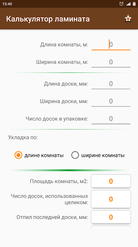 Приложение Калькулятор ламината (расчет ламината) позволяет рассчитать количество ламината, нужное для укладки на пол. Калькулятор учитывает способ укладки: прямой, диагональный. Для расчета вам достаточно ввести размеры помещения, а также доски ламината. Вы можете узнать не только количество упаковок ламината, но также количество досок использованных целиком, количество неиспользованных досок.