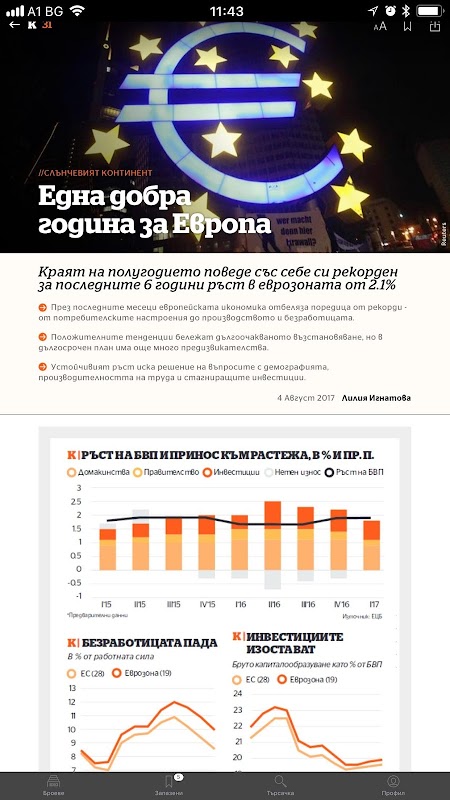 Четете и прелиствате отделните статии в рамките на броя, подредени в логиката на рубриките му. Лесно намирате теми от архива. Имате възможност да запазвате и четете статии и броеве offline.