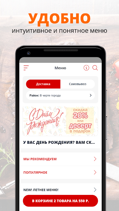 Ordering and delivery of pizza, pasta, salads, drinks. From 10:00 a.m. to 10:30 p.m.