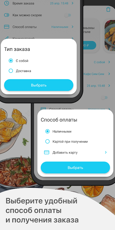 How to place an order in the Cafe Sim-Sim application: select the items you like from the menu, add them to the basket and go to the checkout screen (by clicking on the basket icon).