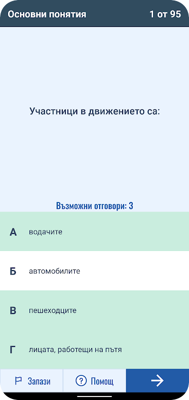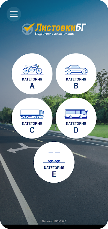 Приложението включва въпроси от категориите A, B, C, D и E, като всяка категория разполага с три режима на обучение.