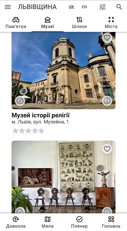Mobile application "Lviv region. Unique heritage" ("Lviv area. Unique heritage") opens and popularizes the rich world of cultural heritage of the Lviv region, which has more than 8,441 sights. The application provides information on 450 cultural heritage sites, including museums, nature reserves, and cultural and tourist routes.