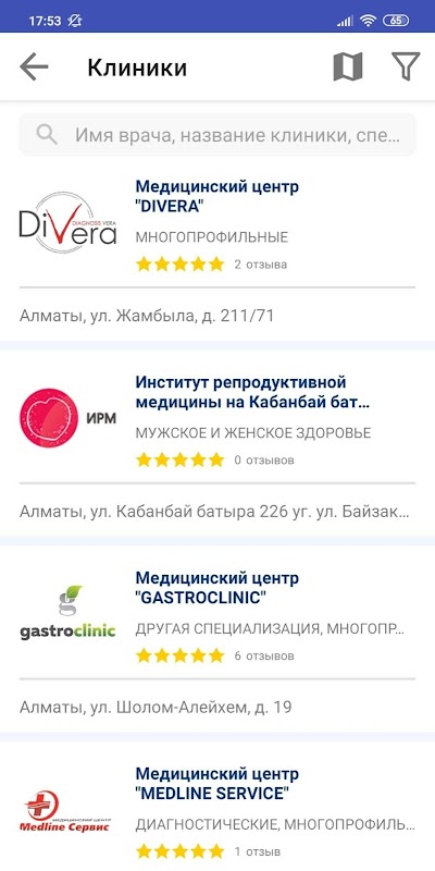 - Search for a doctor, clinic and medical service in the selected region (select from available regions). The database of available clinics and doctors in the application is constantly updated