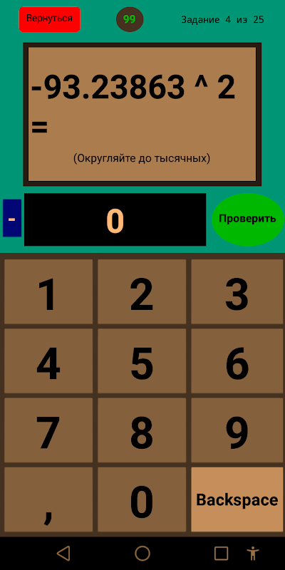 You will be given examples, the answers to each of which you must give within 100 seconds. You can solve addition, subtraction, multiplication, division and squaring problems. In future updates, functions such as finding the root and the power of 2 may be added.