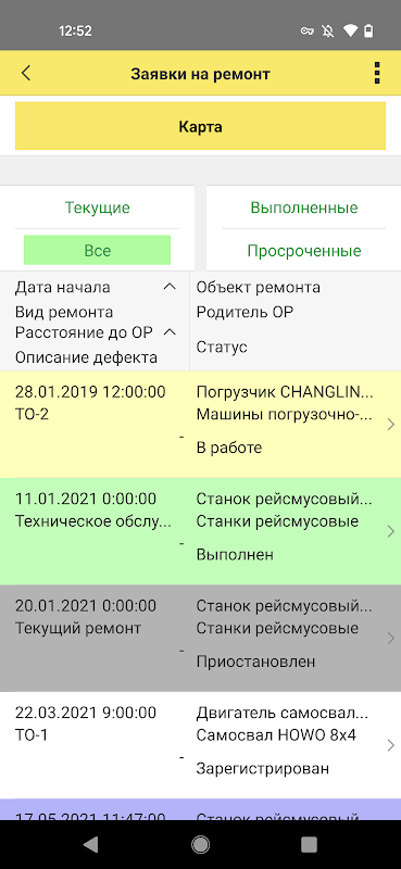 • Color-coded request lists allow you to quickly identify their status (depending on the severity of the defect, condition, equipment criticality, or type of repair). For example, repair requests can be color-coded depending on their status: "Registered," "In Progress," "Suspended," "Completed," etc.
