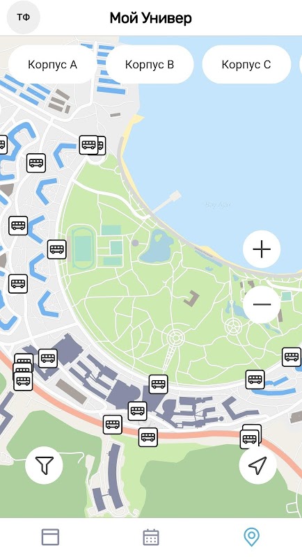 The application for students and employees of FEFU, includes a map and schedule.