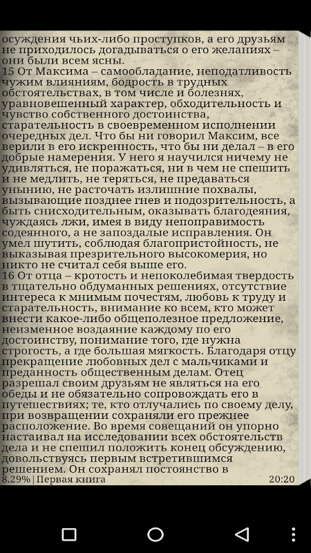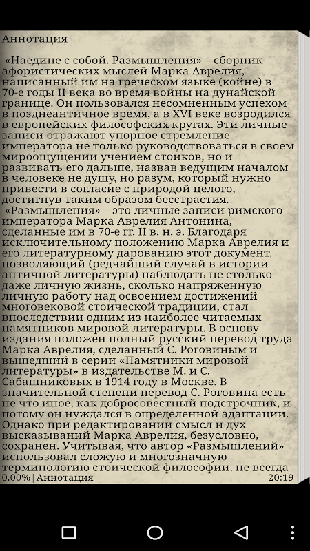 There was such an emperor: he lived happily, did not abuse any excesses, had a strong family, pinned great hopes on his son-heir, strengthened the borders of the Roman Empire, not without success participated in continuous wars and repelled the onslaught of barbarians, died unexpectedly in a campaign not far from modern Vienna. At leisure, he made brief notes about what was thought out and what he had experienced; He wrote not in Latin, in ancient Greek. The result was a masterpiece book, which was discovered after the death of the emperor, examining his archive.